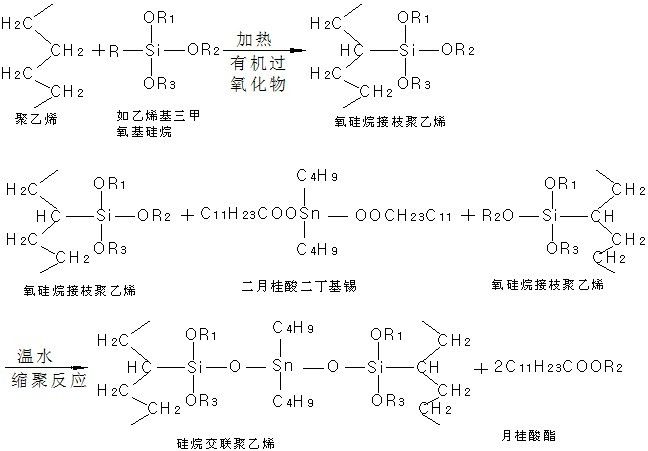 硅烷交联聚乙烯也是一种化学交联聚乙烯。其主要机理是先将有机硅氧烷和聚乙烯在特定条件下,如在机械力、有机过氧化物和温度的作用下,使聚乙烯生成具有烷氧甲硅基交联活性点的接枝共聚物,然后在催化剂(常用二月桂酸二丁基锡)和水的存在下,缩聚交联,生成交联聚乙烯。反应方程式如下:
