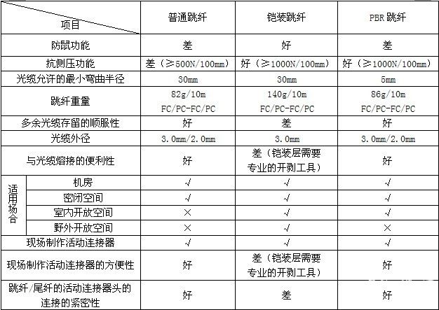 2、PBR跳纤与其它跳纤对比(见表1)