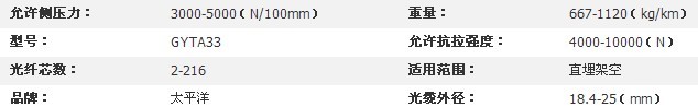 芯数 | 光缆外径(mm) | 光缆重量(kg/km) | 最小弯曲半径(mm) | 光缆拉伸性能 (N) | 光缆压扁性能 (N) | |||
