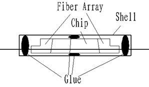 在裸单元制作好后,还需对裸单元进行保护,通常的保护方法为加一个外壳然后用胶水将裸单元固定在外壳里面,里面的加胶方式有二种,一种是采用传统熔融拉锥钢管的封装方法--灌满注胶,但传统的拉锥分路器,是将分路的锥区悬空在石英槽里面,然后再套上热缩管后再进行灌胶封装的,所以实际上锥区是不受热缩管与胶的力的,而PLC芯片不一样,由于其没有槽让其悬空,那么如果加热缩管或灌满胶之后,在胶水收缩或膨胀过程中在陈列与芯片之间会产生一个较大的剪切力和轴向力,从而导致指标变坏;如果加个槽让其悬空,指标可能会满足要求,但在追求小型化以及节能环保的今天,这同样是不适用的;另一种方法是三点加胶,即在输入陈列、输出陈列的纤上及波导上中间加胶就可以,可以选用普通的硅胶(硅胶寿命长,耐老化),邵氏硬度不要大于35就行,太硬产生的力会产生很大的应力,当然太小也不行,如果硬度过小,胶水太软,裸单元与外壳就没办法保持住,从而外壳失去保护意义,我们认为这个胶的邵氏硬度在15-30之间是一个较好的选择。图2是三点加胶方式的示意图。