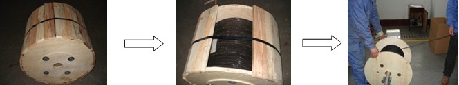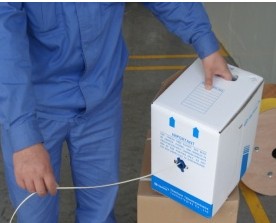 由于普通盘具在光缆施工时较为笨重,造成较大的人力消耗,为使整个光缆施工过程更加便利,图5对蝶型光缆的包装形式也进行了改进,它采用箱式包装,每箱500米,类似目前的五类线。纸箱包装比原有包装有四大优势:(1)包装规整,能最大程度利用储运空间,节省物流成本;(2)重量轻(5.5kg/箱),便于装卸储运等物流作业;(3)长度一致,便于流转过程中的收发货统计管理等工作;(4)独特的成圈方式,单人即可方便实现现场裁线。