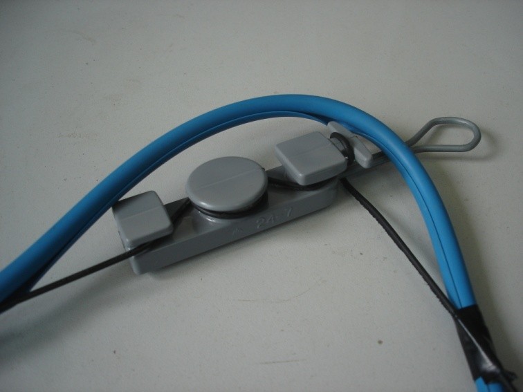 对于自承式蝶型光缆,应用较多的是东南亚、南美地区。自承式蝶型光缆的裁线、布放、预留、开剥和熔接作业与室内非金属型蝶型光缆大致相同。施工时将光缆金属加强件与光单元剥离、剪断,金属加强件通过收紧器固定在入户光缆挂钩(位于电杆上或墙上)上(图14),剩余光缆剥离金属吊线后,非金属光缆单元部分引入室内。