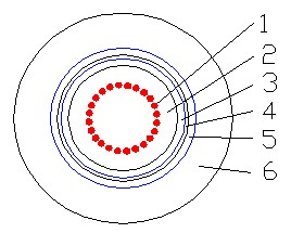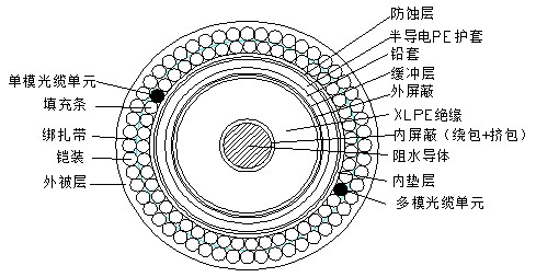2、典型的光纤复合结构根据选择的单芯220kV海缆结构,光纤单元结构特性,通信、预警、测温监控对光纤单元分布的要求。我们设计这一种220kV光纤复合海缆。图2为220kV光纤复合海缆结构示意图。