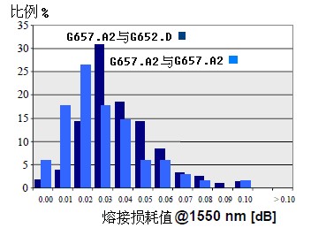 图12代表了所有熔接试验结果的统计,无论G.657.A2弯曲不敏感单模光纤是与同型号光纤熔接或是与G.652.D光纤熔接。 试验了300个接头,检测结果显示:与同型号光纤熔接时,平均损耗为0.03dB,与G.652.D光纤熔接时平均损耗为0.04dB。熔接机是市场上排名前5名制造商推出的熔接机。这样的平均熔接损耗和熔接损耗的分布宽度非常低,这些数据足以证明 在实际应用中G.657.A2弯曲不敏感单模光纤,可以作为普通G.652.D光纤处理。