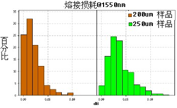 如图13所示200微米光纤熔接性能与250微米光纤的熔接性能相近。所有测试接头中,97.5%低于0.10dB,与250微米涂层光纤具有相同的分布。