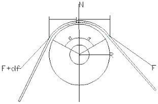 假定光缆在滑轮上无弹性伸长,R--滑轮半径;L--滑轮接触的一段光缆长度; N--滑轮对该段光缆在拉力下的正压力;α--光缆沿滑轮的包角;由于光缆是在滑轮上滑动,所以该段光缆一端的拉力为F,另一端的拉力为F+df,其中df是滑轮对光缆的阻力,通过对定滑轮上物体受力的分析,我们知道该处缆受到两侧的力,即N为两侧力之和,