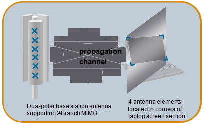 事实上,LTE MIMO-OFDM技术的优点是它可以以单独载波的形式重叠在现有的R99/HSDPA网络上,站址可以共享或复用,现有的天线系统也可以复用,不用更换就可以支持至少2x2的MIMO配置。如果现有天线系统是每个扇区一个交叉极化的天线,它由一路发射分支,两路接收分支。同样的天线可以被用来支持2x1和2x2的MIMO配置,只需部署ENodeB和具备MIMO-OFDM能力的UE就行。这是因为这两路交叉极化的天线可以支持MIMO发射和接收而不需要对天线系统做任何物理上的改变。如果现有的天线系统采用2列交叉极化的较大型号的天线,它同样可以用来支持4x1, 4x2和4x4 MIMO的配置。