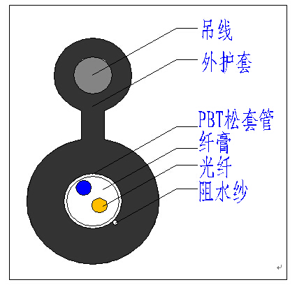 GYXTC8Y光缆是一种8字型自承式结构,缆芯为单根束管,直接采用PE料包覆而成。其中,吊线部分采用镀锌钢丝保证加强件在不限跨距点外露不遭锈蚀,缆芯部分放置一根纵向阻水纱,保证光缆每个截面不渗水。该光缆结构紧凑、重量轻、几何尺寸小,便于施工、维护。(见图1)