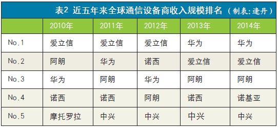 2014年,华为和中兴两家国内厂商的实力进一步提升。同时,华为运营商业务的收入首次超越爱立信,成为全球头号通信设备提供商。