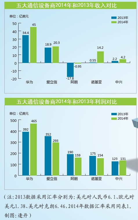 欣喜的是,五大厂商的利润都进入上行通道,实现了有效增长。其中,华为利润达到45亿美元,同比增长32.7%;中兴和诺基亚利润则实现了成倍增长;爱立信利润小幅度增长,从2013年的19亿美元到2014年的20.3亿美元;阿朗虽然还未实现扭亏为盈,但利润已经从负17.8亿美元锐减到负0.95亿美元。