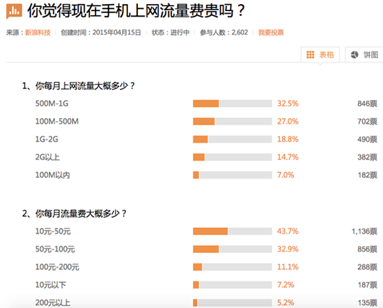 据新浪科技截至4月15日21:30分的调查结果显示,超过50%的用户每月使用的流量介于500M-2G之间,27%的用户月均流量消费在100M-500M之间,另外14.7%的用户月均流量消费超过了2G,仅7%的用户月均流量消费在100M以内。在月均流量花费方面,10元-50元的用户占比最高,达到了43.7%,50元-100元的用户占比为32.9%,100元以上的用户占比达16.3%,7.2%的用户消费在10元以内。