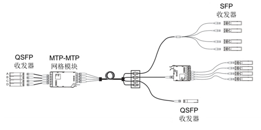 现在很多用户已经开始使用高密度40G交换机板卡来实现高密度10G应用。例如,一个高密度10G SFP+板卡有48个10G端口,而一个高密度40G QSFP+ 板卡可具有36个40G端口。这样在同样的配线空间和能耗条件下使用40G板卡就可以获得4x36 = 144个10G端口,从而降低了10G单端口的成本和能耗。图2显示了网格模块在布线系统中的三种典型应用。ABCD四个QSFP40G通道通过网格模块的输入端MTP被分支为4x4个10G通道,再通过模块内部全交叉互联映射到网格模块的MTP输出端。这样每一个网格模块MTP输出端都具有ABCD 4个QSFP收发器中任意一个的10G通道;从而实现与一个输出端相连的4个SFP收发器均对应4个不同的QSFP端口中的一个10G通道,实现了脊交换机和叶交换机的全交叉互联。