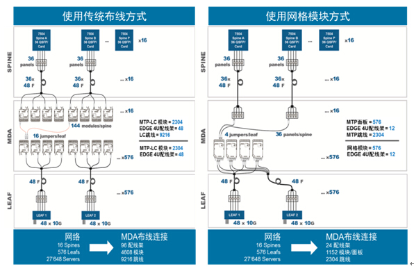 图4: 脊叶两层网络结构MDA全交叉互联布线结构对比
