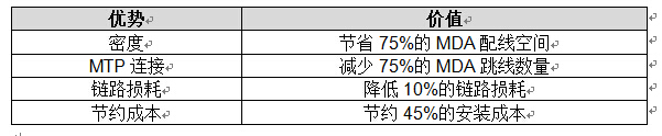 如果使用传统布线方式,要实现脊交换机和叶交换机的全交叉互联需要在MDA中通过MTP-LC模块将每个脊交换机的40G QSFP+端口分支为4x10G端口再通过跳线交叉互联到与叶交换机10GSFP+端口相连的相同数量的MTP-LC模块(如图4左图所示)。这种传统方式因布线系统结构复杂成本相对较高,MDA占用空间大等缺点并未获得广泛应用。在这种应用场景中,使用网格模块就可以很好的解决这些问题。如图4右图所示,通过在MDA中使用网格模块我们可以无需将脊交换机的40G端口使用MTP-LC模块分支为10G端口就能实现与叶交换机的全交叉互联,从而大大优化MDA的布线结构并可为用户带来如表2所示的很多价值。