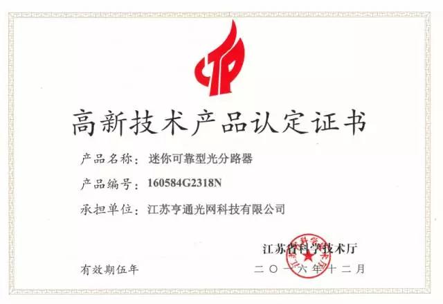 近日,亨通通信产业集团江苏亨通光网科技有限公司(以下简称:亨通光网)“迷你可靠型光分路器”获江苏省科学技术厅颁发的高新技术产品认定证书。
