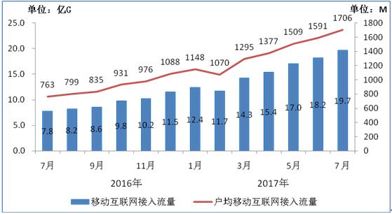 图8 2016-2017年7月当月移动互联网接入流量和户均流量比较