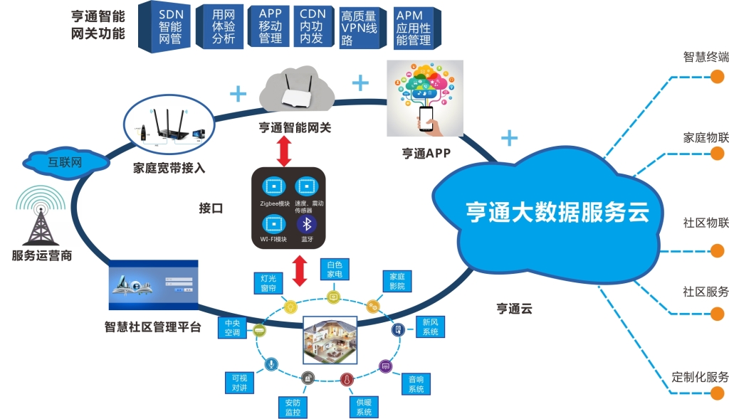 作为“智慧社区产业联盟”发起单位及行业首家ISP(互联网服务提供商)牌照、行业首家宽带接入驻地网业务牌照获得者,亨通依托大数据管理云平台,充分借助互联网和物联网,构建现代化、信息化和智能化城市社区运营模式和以人为本家庭智能管理系统,为家庭/社区/城市提供安全、高效、便捷的智慧化综合服务。