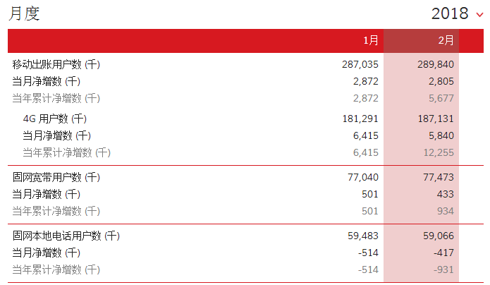 固网业务方面,固网宽带用户2月净增43.3万户,固网宽带用户累计达7747.3万户;本地电话2月减少41.7万户,本地电话用户累计达5906.6万户。