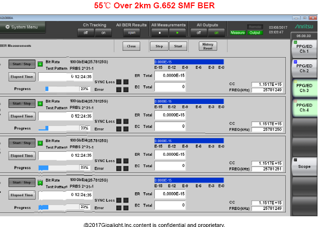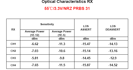 易飞扬的QSFP28 PSM4在三温(-5°C/25°C /55°C)环境下均表现出良好优越的性能,四通道均匀性和一致性都满足设计指标,三温情况下四路光眼图裕量(MARGIN)均高于15%,灵敏度优于协议约束的-9.5dbm(1E-5).