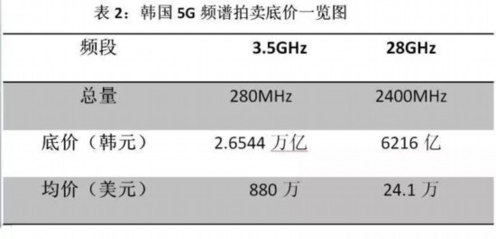 相比英国5G频谱拍卖价格,韩国政府给出的拍卖底价到底高不高呢?事实上,整体价格的绝对值比较并没有意义,具体到同频段每MHz单价的比较才更具有借鉴意义。来自韩国科技与信息通讯技术部的数据显示,此次5G频谱拍卖包括280MHz的3.5GHz频谱和2400MHz的28GHz频谱,3.5GHz频谱起价为2.6544万亿韩元,28GHz频谱起价为6216亿韩元。