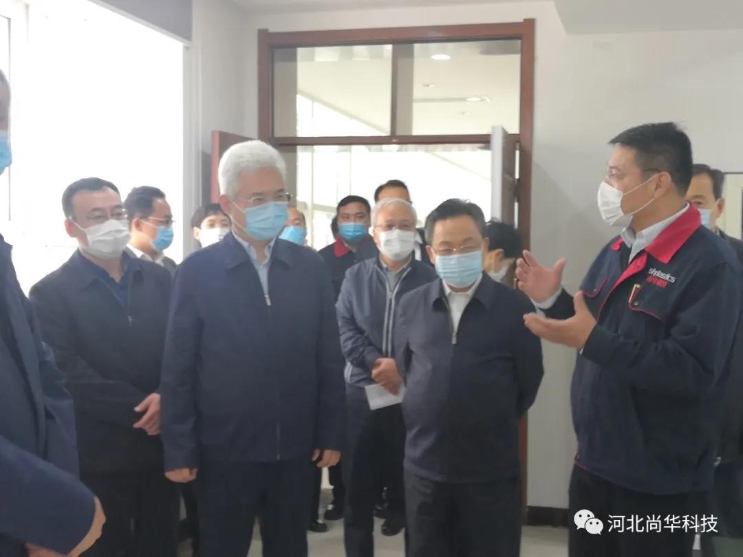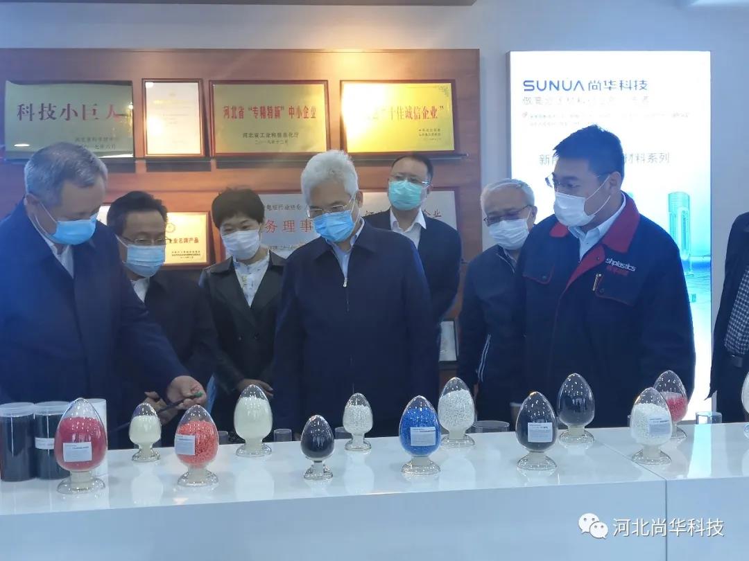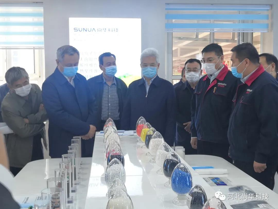 王宝山及调研团一行人参观了河北尚华塑料科技有限公司的研发成果,总经理杜敬亮介绍了适用于5G光电线缆、新能源汽车线缆、碳纤维复合材料等产品的科技创新成果,及防疫物资医用口罩熔喷布原材料的研发实验情况。