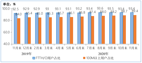 图4 2019年-2020年11月末光纤接入(FTTH/O)和100Mbps及以上接入速率的固定互联网宽带接入用户占比情况