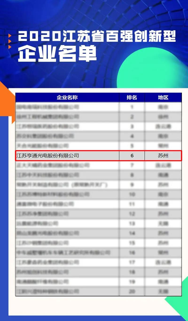 近日,江苏省科技发展战略研究院向社会发布了“2020江苏省百强创新型企业”名单。榜单显示,江苏亨通光电股份有限公司跻身前六。