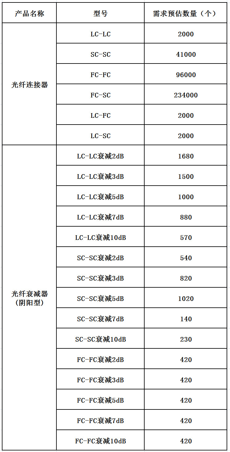 5月7日,中国移动甘肃公司2021-2022年光纤连接器、光纤衰减器采购项目比选公告发布:计划采购光纤连接器和光纤衰减器共38.748万个,详细型号及预估数量如下表: