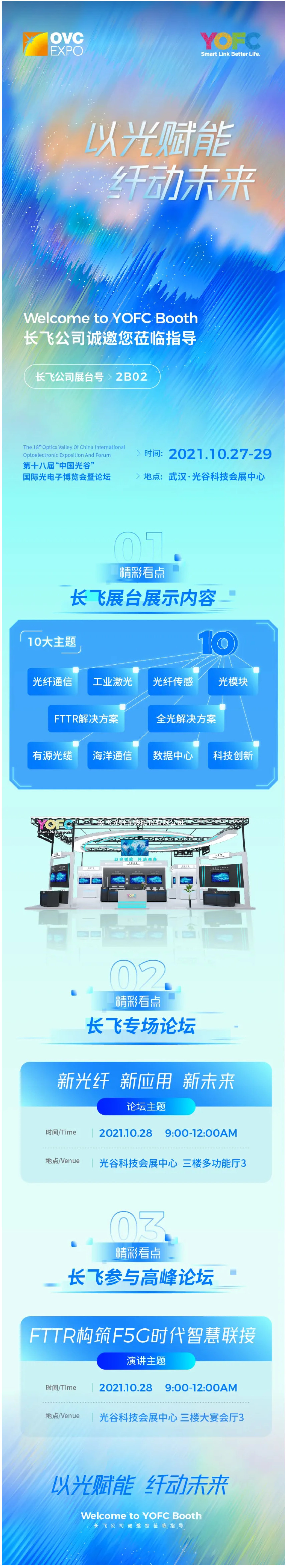 2021年10月27-29日,第十八届“中国光谷”国际光电子博览会暨论坛(以下简称“武汉光博会”)将在光谷科技会展中心盛大举行。长飞光纤光缆股份有限公司(以下简称“长飞公司”,股票代码:601869.SH、06869.HK)以“以光赋能 纤动未来”为主题,将携光纤通信、工业激光、光纤传感、光模块、数据中心等10大主题产品和解决方案精彩亮相。展会期间还将在展馆内举办“新光纤 新应用 新未来”主题的长飞专场论坛,欢迎广大行业合作伙伴莅临长飞公司展台、专场论坛等活动现场。