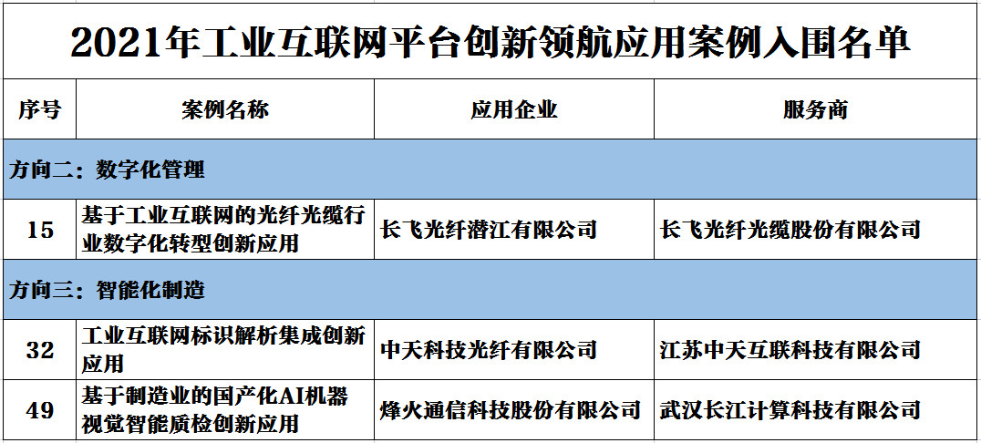 2021/11/26 责任编辑:swift 11月24日,根据《工业和信息化部办公厅关于组织开展2021年工业互联网平台创新领航应用案例征集活动的通知》(工信厅信发函〔2021〕160号)要求,经企业自主申报、地方推荐、合规性审查和专家评审等环节,形成了2021年工业互联网平台创新领航应用案例入围名单。名单中,长飞光纤潜江有限公司、中天科技光纤有限公司、烽火通信科技股份有限公司上榜。见下图:其他