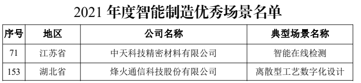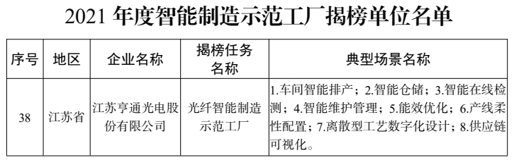 2022/02/21 责任编辑:swift 访问:4043 2月18日,工业和信息化部、国家发展和改革委员会、财政部、国家市场监督管理总局将2021年度智能制造示范工厂揭榜单位和优秀场景名单予以公告。共计有3家光纤光缆厂商名列其中。“2021年度智能制造示范工厂揭榜单位名单”中,亨通光电上榜。见下图:“2021年度智能制造优秀场景名单”中,中天科技、烽火通信上榜。见下图:本文整理自工信部官网光纤光缆