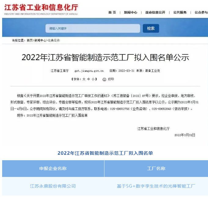 3月31日,江苏省工信厅对2022年江苏省智能制造示范工厂项目进行公示。永鼎股份成功入围该公示名单。
