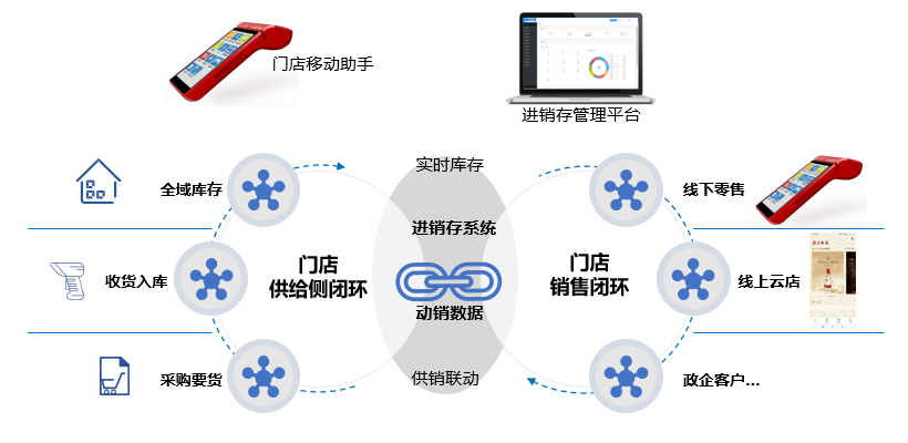门店进销存系统集合进货、销售、库存、调拨、财务、数据管理等各项功能,逐步打通门店自身的供给和销售数据断点,解决门店连而不锁、锁而不牢、牢而不顺的问题。
