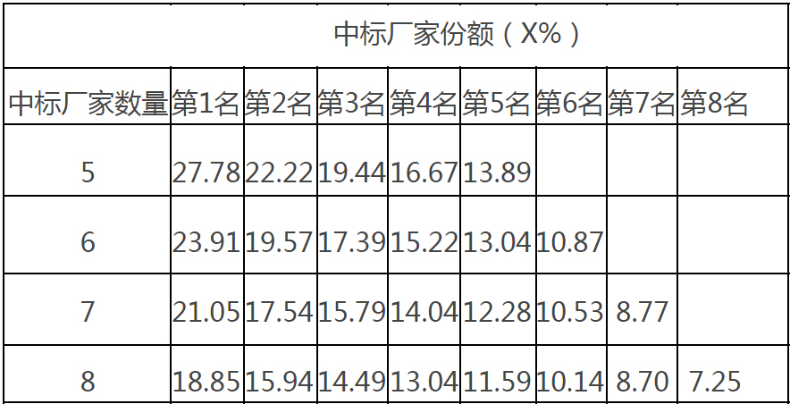 不同中标供应商数量下的份额如下: