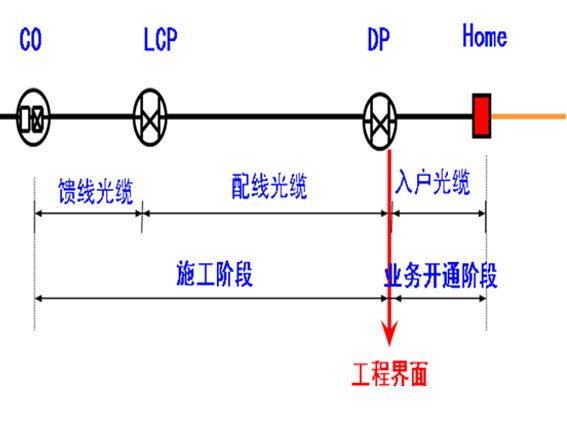 烽火一直倡导在FTTH阶段采用分阶段的施工模式,这点是在大量的项目经验中得来的最佳方式。将工程界面定义在接入点,实现第一期工程的快速检测和竣工,将繁杂的入户段光缆的施工放置在后期进行执行,这样一方面可以对整体项目很快的做完整的验收、另一方面可以减少由于初期实装率较低的问题带来的一次性投资较大的问题。如还是采用传统的端到端施工、测试,会因为各种终端环境的复杂性造成工程工期过长或者很难进行竣工。见图3所示。