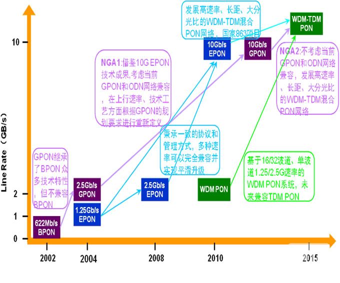 从PON技术发展来看今后向着更高速率、更大带宽、更多分光比的趋势演进。见图1所示。