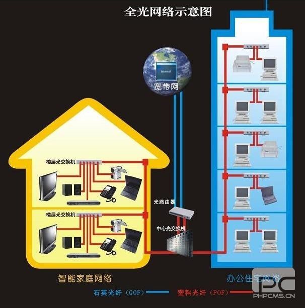 随着3G通信和FTTx光纤通信技术的发展,利用塑料光纤结合石英光纤铺设入户光纤通信网络技术的研究成为光纤通信技术研究的一个热点。如图4所示,利用石英光纤在城域网和骨干网等较长距离的宽带网上传输高速数据,然后在办公住宅网络和智能家庭网络利用塑料光纤实现高速数据通信,从而在整个网络实现全光纤通信。