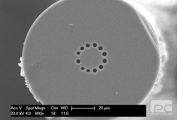 烽火通信作为国内光纤通信技术的领航者,一直致力于光纤前沿技术的研究。在入户光纤研究方面,烽火通信开发出宽波段色素补偿光纤以及具有自主知识产权的小弯曲半径单模光纤,在7.5mm弯曲半径下,仍具有良好的弯曲损耗,完全符合ITUTG.657B的要求。另外在国家973项目的支撑下,烽火通信开发出一种FTTH用微结构光纤,可以在3mm的弯曲半径下实现低损耗的光通信。其结构如图6所示。