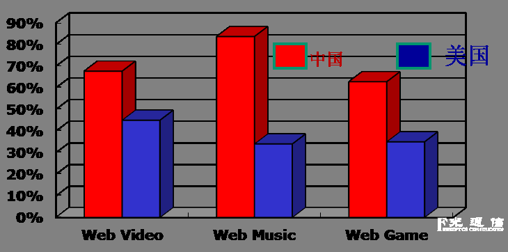 图1是去年年底统计中国3G业务比例,蓝色是P2P,P2P几乎占了3G业务的一半。图2上红色是中国的网民,蓝色是美国网民,分别是在上网看视频、音乐、包括玩游戏这些网民占全体网民比例,可见哪一项中国都高于美国,娱乐是挡不住的诱惑。