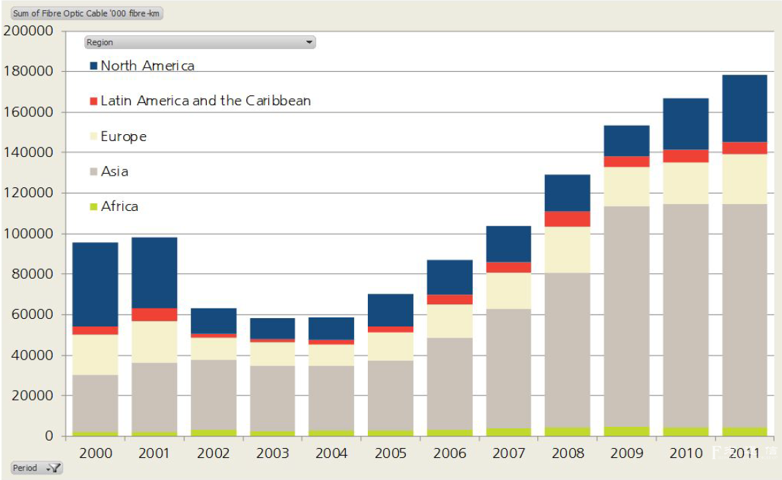 在2010年中国的光纤和光缆容量利用率大约90%,集中采购价格约每年下降12%。2000年,1纤芯公里的光纤价格为1800元,到2009年跌到了85元,2010年平均价格为75元,最低价格仅为55元。