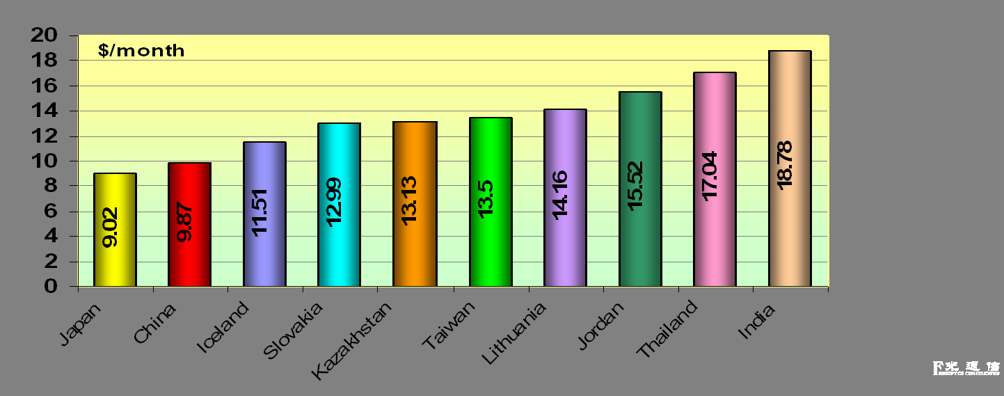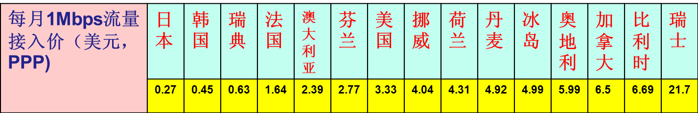 从部分发达国家以每月1Mbit/s流量的接入费看,瑞士比较高,为21.7美元,日本比较低,为0.27 美元。以ITU公布的亚洲部分国家和地区每月家庭宽带接入费来看,日本9.02美元、中国9.87美元、哈萨克斯坦13.13美元、中国台湾地区13.5美元、约旦15.52美元、泰国17.04美元、印度18.78美元。与其他国家相比,中国网民宽带上网费用绝对值不算高。但是,中国互联网络信息中心(CNNIC)2008 年6月公布的在家上网的网民月均家庭上网接入费用为77元/月,网民平均月收入为1787元,上网费占收入4.3%;如果加上电话(包括移动电话)的支出,通信占可支配收入达8%,这一比例远高于发达国家的水平。中国网民宽带上网费用绝对值并不高,但相对于收入仍然高。