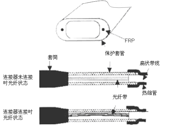 保护套管(图4所示)起到的作用如下:连接器接插时由于连接器内弹簧的弹回将产生的多余长度,而紧套结构光纤带光缆在光纤带与护套之间没有间隙;在连接器组件中采用保护管,当从光缆端头上去除护套之后,把光纤带套入保护套管中,连接器弹回所产生的光纤带的余长将被保护套管吸收,避免极度弯曲损耗的产生,同时为避免光缆弯曲时的压扁,保护套管设计成扁状并在保护管中埋入两根抗拉件,与扁状带缆相同。