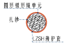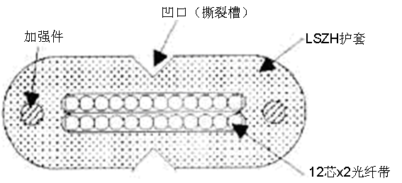 扁状带缆(图5所示)护套采用LSZH,这种材料满足水平及垂直级护套料的规范,护套紧密地涂覆在单维或多维叠堆的光纤带四周,其中两根0.4mm的FRP起到抗拉及限制收缩功能。在光纤带叠堆上面的两个凹口可方便的撕开护套取出光纤带而不损伤光纤带。