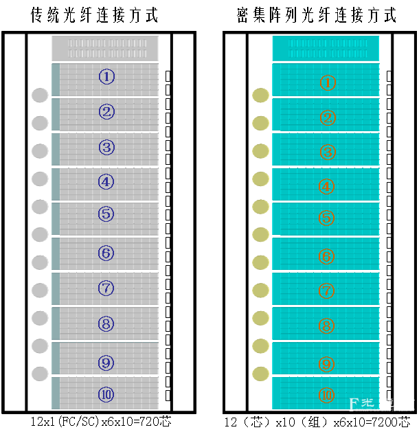 采用12芯密集阵列光纤连接模块光配架与传统光纤连接器光配架对比图6所示,相同立方(长×宽×高)承载架体下的比较。