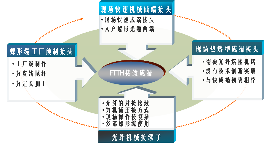 FTTH接续与成端技术(主要是指FTTH最后一根入户蝶形光缆两端的接续与成端)可以归纳总结为如下四个大类,其中蝶形“皮线”光缆尾纤、现场热熔性快速接头、光纤快速连接器成为目前技术趋势,但蝶形皮线尾纤和现场热熔性的快速接头都属于基于前期光纤快速连接器和冷接续子的状况而出现的阶段性产品或特性化产品,而非解决和推进FTTH高效部署的关键技术。