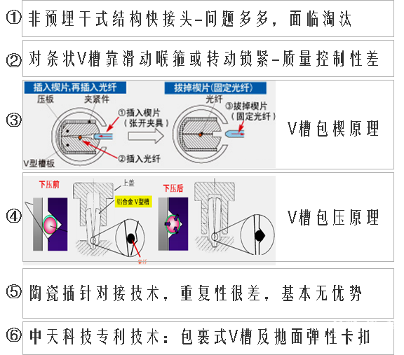 光纤快速连接器的关键技术点在于光纤端面的V槽对接和压接原理,根据各自特点目前市场各类光纤快速连接器的关键技术原来为如图18的6大类: