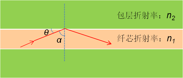提高光纤抗弯曲损耗能力的实质就是保证光在纤芯中尽可能的发生全反射而不泄露到包层中去。如果要增大光在纤芯中的全反射,则要求图2中的临界角α越小越好,而临界角余角θ则是越大越好。由于cos(θ)=n2⁄n1,那么希望n2⁄n1越小越好,因此相对折射率差Δ=(n1-n2)⁄n1越大就越能保证光在纤芯中容易发生全反射而不泄露到包层中去。