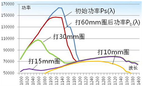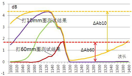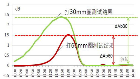 从图4中我们可以看出打60mm直径的圈很难滤除高阶模,∆A(b)为1.7dB左右,不能达到≥2dB的测试要求。打10mm的圈时虽然很好的滤除了高阶模,但却影响了基模传输,使∆A(b)随着波长的增加呈较明显的变化趋势。而打30mm或15mm直径的圈时,不仅较好的滤除了高阶模,使∆A(b)达到了≥2dB的要求,且没有影响基模的传输。