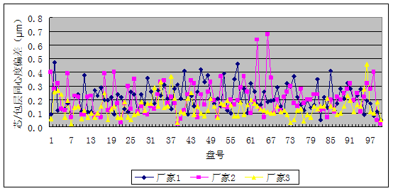 图2 3个厂家光纤芯/包层同心度偏差参数的比较