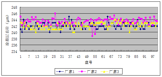 图4 3个厂家光纤涂覆层直径(未着色)参数的比较